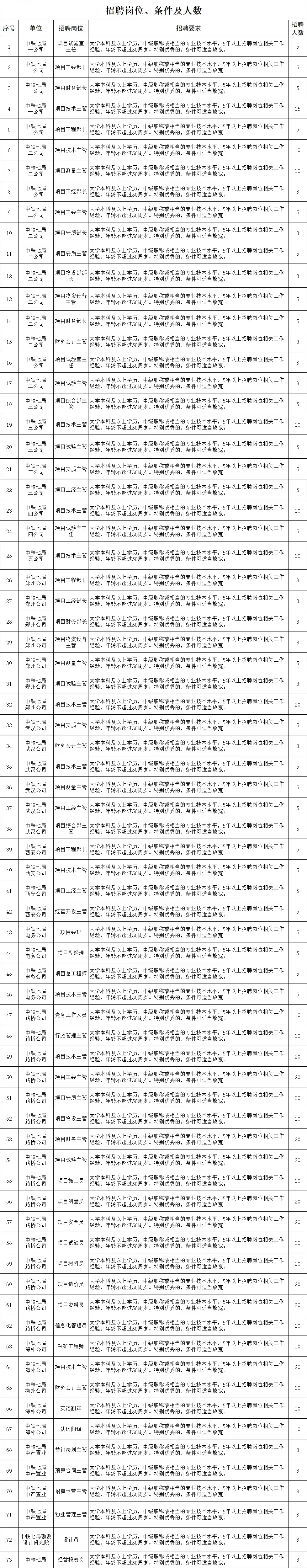 因生產(chǎn)經(jīng)營及發(fā)展需要,中鐵七局及所屬各單位現(xiàn)面向社會(huì)公開招聘經(jīng)營管理和專業(yè)技術(shù)人才。具體事宜如下: