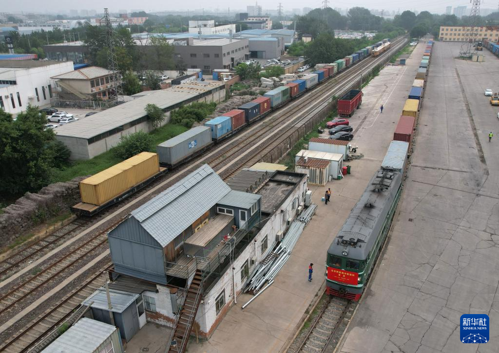 6月30日,北京至阿塞拜疆巴庫的跨里海中歐班列??吭谖挥诒本┦蟹可絽^(qū)的北京國際陸港等待發(fā)車(無人機(jī)照片)。