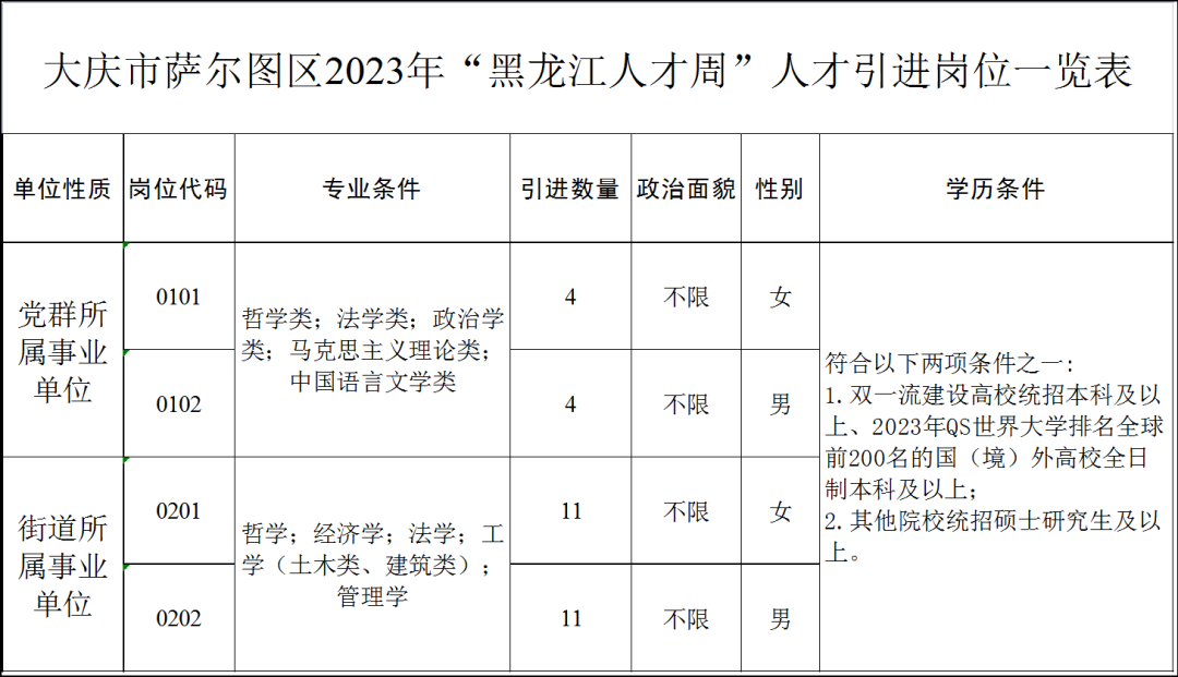 計(jì)劃引進(jìn)黨群所屬事業(yè)單位工作人員8人,街道所屬事業(yè)單位工作人員22人,具體引進(jìn)崗位、數(shù)量要求詳見(jiàn)《薩爾圖區(qū)2023年“黑龍江人才周”人才引進(jìn)崗位一覽表》(見(jiàn)附件)。