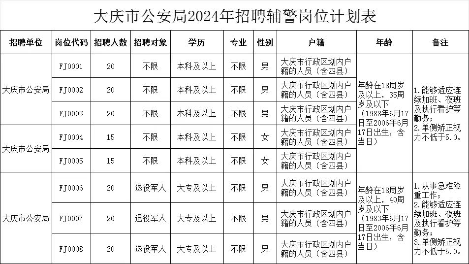 此次公開招聘輔警共計(jì)150人,具體招聘崗位、人數(shù)、條件等詳見《大慶市公安局2024年招聘輔警崗位計(jì)劃表》(附件1)。